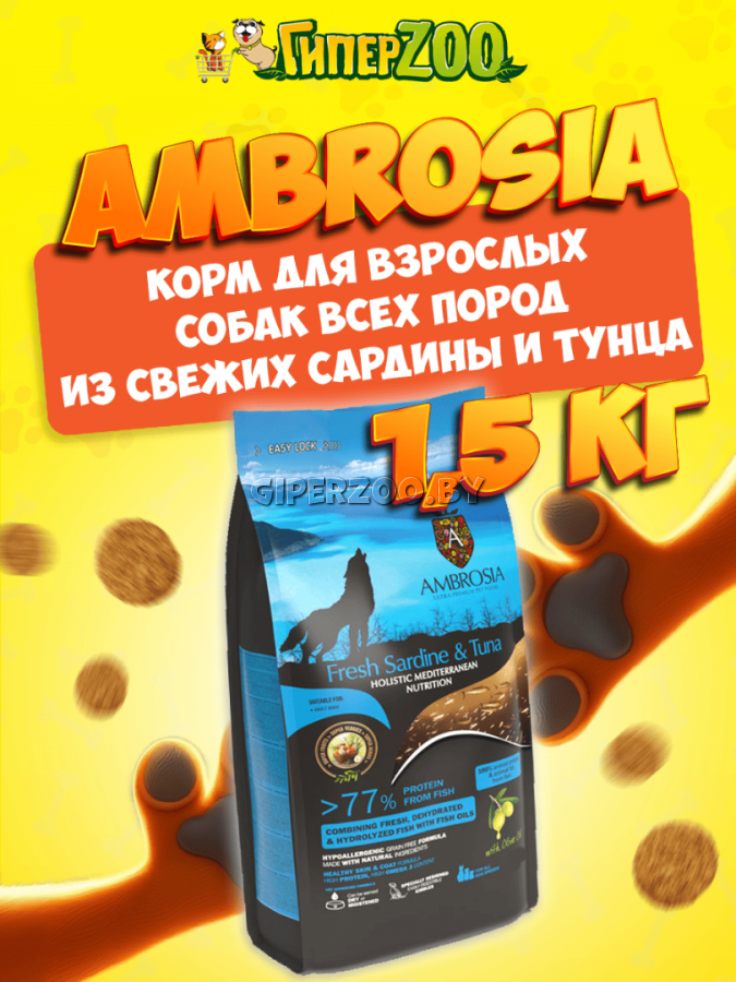 Корм сухой "AMBROSIA MEDITERRANEAN" для взрослых собак всех пород, свежая сардина и тунец 1,5кг * Подходит для возрастных, стерилизованных и собак с лишним весом. Наш рецепт Ambrosia Fresh Sardine & Tuna сочетает в себе легко усваиваемый рыбий белок, поступающий из свежего филе сардины, а также высококачественный белок из тунца. Почти в нужном количестве оливкового масла и смеси средиземноморских фруктов и трав мы предлагаем гипоаллергенный, средиземноморский стиль, беззерновой корм для собак, полный антиоксидантов, подходящих для всех пород собак. Аромат и вкус, поставляемый комбинацией ингредиентов человеческого класса, несомненно, порадуют вашу собаку, предлагая целостное питание, которое обеспечивает здоровье и долговечность. СОСТАВ:Рыба 58% (свежеприготовленная сардина (30%), сушеный тунец (20%), цельный горох, лососевое масло (5%), гидролизат белка лосося (3%), сладкий картофель, , сушеный жом свеклы, кокосовое масло (3%), оливковое масло, сушеная люцерна, сушеный корень цикория (источник инулина и фр