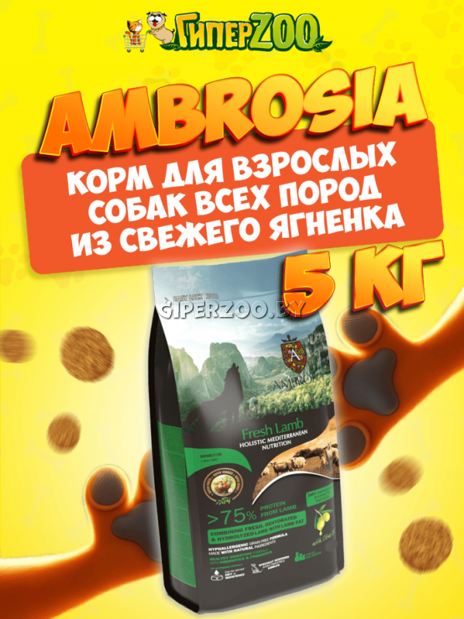 Корм сухой "AMBROSIA MEDITERRANEAN" для взрослых собак всех пород, свежий ягненок, 5кг Наш рецепт Ambrosia Fresh Lamb сочетает в себе преимущества высококачественного, легко усваиваемого и гипоаллергенного белка, поступающего из свежего ягненка. Корм содержит в нужном количестве оливковое масло и смесь средиземноморских фруктов и трав. Гипоаллергенный, беззерновой, полный антиоксидантов, подходит для всех пород собак. Аромат и вкус, поставляемый комбинацией ингредиентов человеческого класса, несомненно, порадуют вашу собаку, предлагая целостное питание, которое обеспечивает здоровье и долговечность. СОСТАВ: баранина 60% (мясо ягненка 30%, вяленая баранина 22%, жир ягнёнка 5%, гидролизованный белок ягненка 3%), сладкий картофель, цельный горох, сушеная люцерна, сушеный жом свеклы, минералы, сушеный корень цикория (естественный источник инулина и фрукто- олигосахаридов 1%), оливковое масло (0,5%), льняное семя, маннановые олигосахариды (0,15%), яблоко сушеное, помидор сушеный, пажитник, груша сушеная, апельс