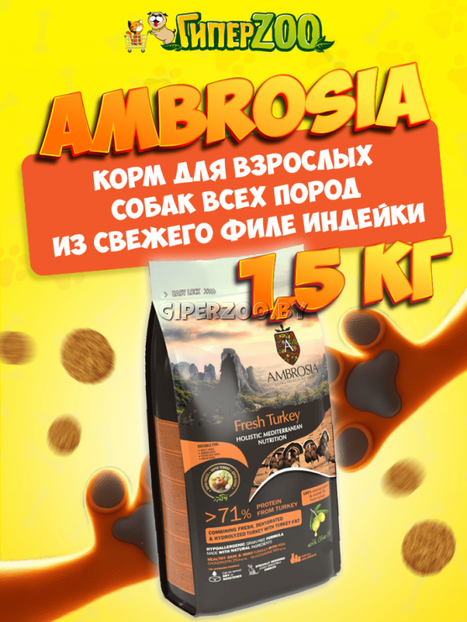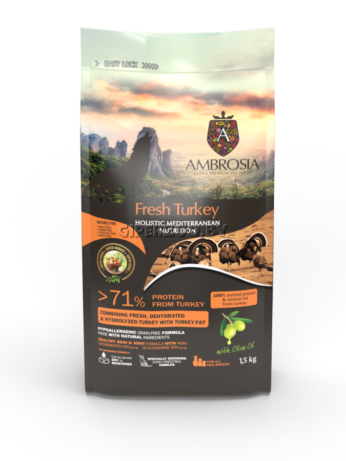 Наш рецепт Ambrosia Fresh Turkey сочетает в себе преимущества высококачественного и в то же время низкожирового белка, полученного из свежего филе индейки. Благодаря необходимому количеству оливкового масла и смеси средиземноморских фруктов и трав мы предлагаем гипоаллергенный, беззерновой корм в средиземноморском стиле, полный антиоксидантов, подходящий для всех пород собак. Аромат и вкус, создаваемые сочетанием ингредиентов человеческого качества, обязательно порадуют вашу собаку, обеспечивая при этом целостное питание, обеспечивающее здоровье и долголетие.