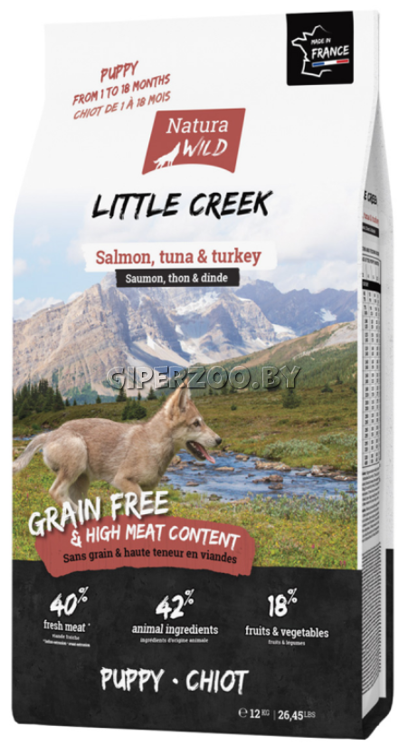 Natura Wild Little Creek - полнорационный беззерновой корм холистик класса для щенков всех пород от 1 до 18 месяцев, беременных и кормящих самок. Корм содержит: свежее мясо лосося 40%, дегидрированное мясо лосося, тунца и индейки, животный жир - 42%, фрукты овощи и травы - 18%. Общее количество ингредиентов животного происхождения - 82%. Назначение: для щенков всех пород до 18 месяцев, беременных и кормящих самок. Особенности и преимущества корма: беззерновая рецептура, высокое содержание свежего лосося (40%), высокое содержание Омега-3 и Омега-6 жирных кислот, натуральные витамины, минералы и антиоксиданты, хондропротекторы. Возраст: от 1 до 18 месяцев, для взрослых, беременных и кормящих самок.