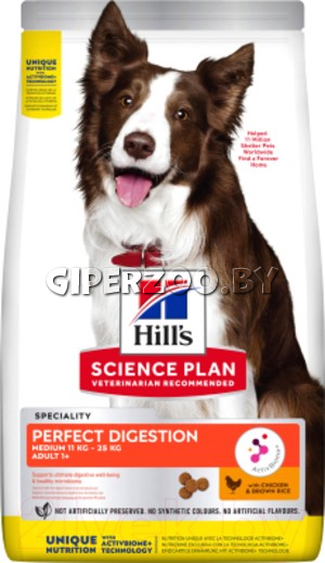 Сухой Корм Hill's Science Plan PERFECT DIGESTION, 14 кг - корм для взрослых собак средних пород, с курицей и коричневым рисом содержит технологию ActivBiome+, эксклюзивную смесь пребиотиков Hill's, которая помогает быстро питать и поддержать баланс уникального микробиома вашего питомца.