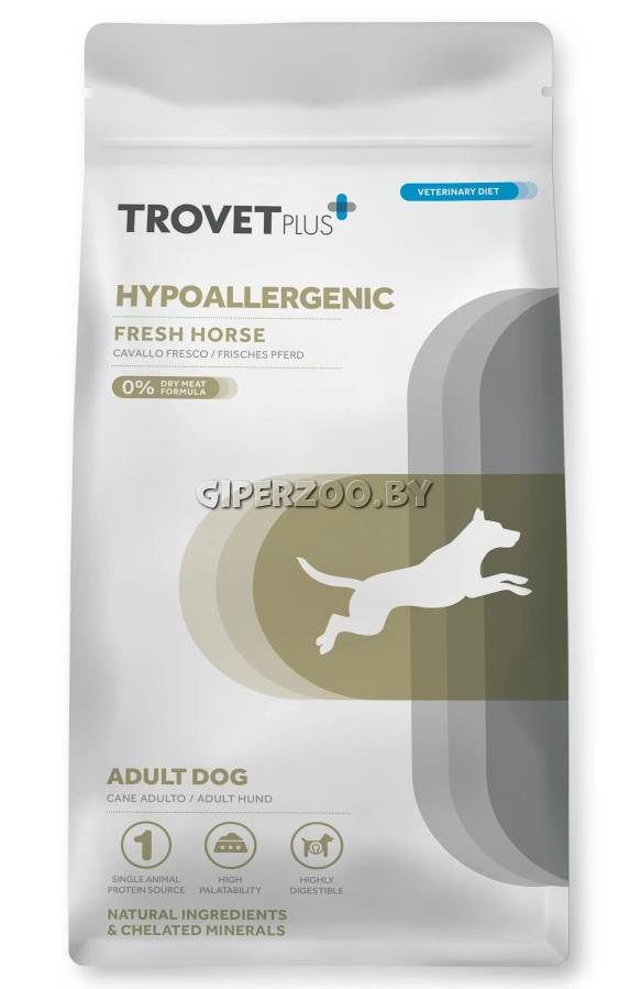 Сухой корм для собак Trovet Plus Hypoallergenic Adult Dog (Конина), 3 кг – полноценный гипоаллергенный корм для взрослых собак для снижения непереносимости ингредиентов и питательных веществ. Содержит тщательно отобранные ингредиенты, чтобы свести к минимуму вероятность иммунологических реакций (пищевая аллергия) или неиммунологических реакций (пищевая непереносимость) в виде проблем с кожей и/или желудочно-кишечными проблемами.
