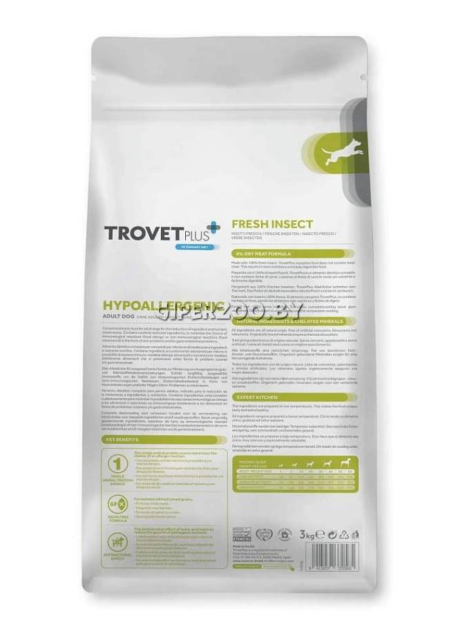 Сухой корм для собак Trovet Plus Adult Dog Hypoallergenic (Насекомые), 3 кг – полноценный гипоаллергенный корм для взрослых собак для снижения непереносимости ингредиентов и питательных веществ. Содержит тщательно отобранные ингредиенты, чтобы свести к минимуму вероятность иммунологических реакций (пищевая аллергия) или неиммунологических реакций (пищевая непереносимость) в виде проблем с кожей и/или желудочно-кишечными проблемами.