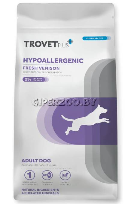 Корм для собак Trovet Plus Adult Dog Hypoallergenic (оленина), 10 кг – полноценный гипоаллергенный корм для взрослых собак, предназначенный для снижения непереносимости ингредиентов и питательных веществ. Содержит тщательно подобранные ингредиенты, чтобы минимизировать вероятность иммунологических реакций (пищевая аллергия) или неиммунологических реакций (пищевая непереносимость), проявляющихся в виде проблем с кожей и/или желудочно-кишечными расстройствами.