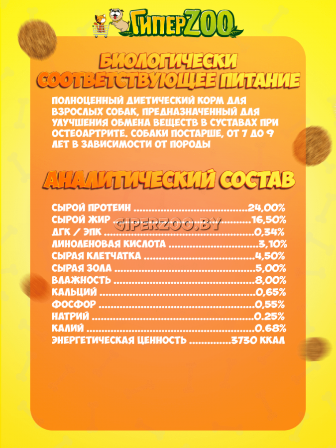 Пищевые добавки: витамин А 15000 МЕ/кг, витамин D3 1500 МЕ/кг, витамин С 350 мг/кг, железо (хелат железа (II) аминокислот гидратированное) 54 мг/кг, йод (калий йодид) 1,20. мг/кг, медь (хелат меди (II) аминокислот гидратированный) 6 мг/кг, марганец (хелат меди (II) аминокислота марганец гидратированная) 24 мг/кг, цинк (хелат аминокислоты цинка гидратированная) 100 мг/кг, селен (L-селенометионин) 0,10 мг/кг, таурин 750 мг/кг, L-карнитин 300 мг/кг.