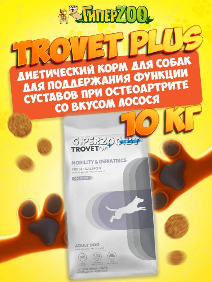 Trovet Plus Adult Dog Mobility & Geriatrics (Лосось) — полноценный диетический корм для взрослых собак, предназначенный для улучшения обмена веществ в суставах при остеоартрите. Собаки постарше, от 7 до 9 лет в зависимости от породы.