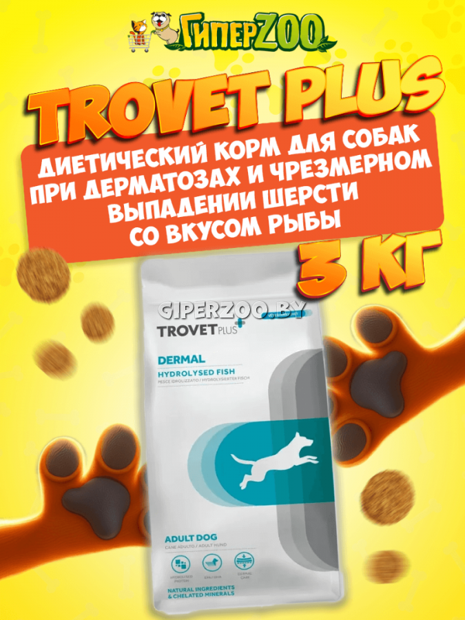 Trovet Plus Adult Dog Dermal (Рыба) — полноценный диетический корм для взрослых собак для снижения непереносимости ингредиентов и питательных веществ и поддержки функции кожи в случае дерматозов и чрезмерного выпадения шерсти.
