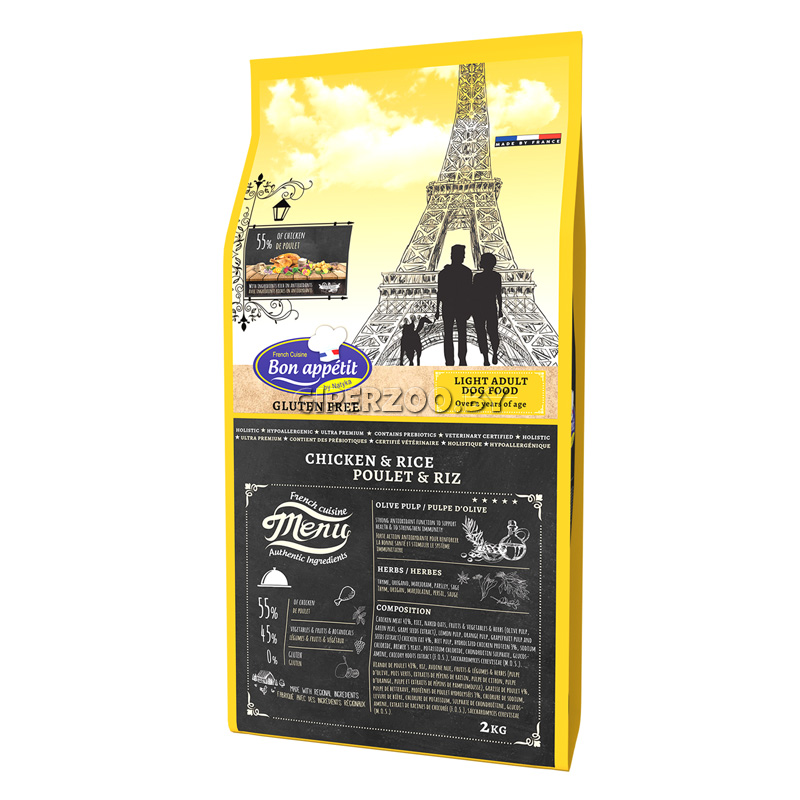 Bon Appétit Light (курица и рис), 2 кг- это сухой корм, богатый курицей, с пониженным содержанием жира и высоким содержанием белка, специально разработан для пожилых собак, для собак с избыточным весом или животных, которые имеют тенденцию к набору лишнего веса.