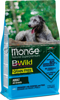 Monge BWild GF ANCHOVIES/POTATOES, 2,5 кг - это полноценный сбалансированный беззерновой рацион для собак всех пород, склонных к аллергической реакции на глютен, а также для молодых животных, ведущих активный образ жизни. Корм изготовлен из анчоуса с картофелем и горохом.