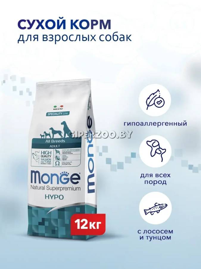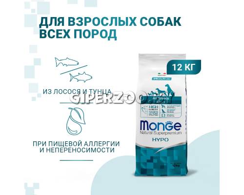 Monge (Монж) Dog Speciality Line Hypo сухой корм на основе тунца и лосося для взрослых собак всех пород 12 кг. Полнорационный сбалансированный корм на основе рыбы для взрослых собак всех пород с повышенной чувствительностью к компонентам корма. Источником белка является рыба (тунец и лосось), а источником углеводов - бурый рис. Может использоваться для собак с чувствительным пищеварением. Пребиотики М.О.S и X.O.S. помогают сохранять естественный баланс кишечной микрофлоры и способствует оптимальному усвоению питательных веществ. Оптимальный баланс Омега-3 и Омега-6 незаменимых жирных кислот в составе корма чрезвычайно важен для поддержания красоты шерсти и здоровья кожи. Без ГМО, искусственных красителей и ароматизаторов. Сделано в Италии.