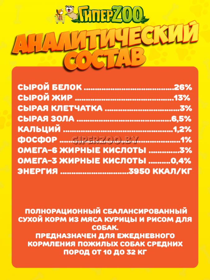 Аналитический Питательная ценность: сырой белок 26%, сырой жир 13%, сырая клетчатка 3%, сырая зола 6,5%, кальций 1,2%, фосфор 1%, омега-6 жирные кислоты 3%, омега-3 жирные кислоты 0,4%. Энергетическая ценность: 3 950 ккал/кг.