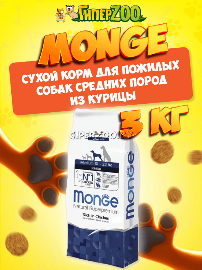 Monge Dog Daily Medium Senior (Курица) – сухой корм из мяса курицы для пожилых собак средних пород. Полнорационный сбалансированный сухой корм из мяса курицы и рисом для собак. Предназначен для ежедневного кормления пожилых собак средних пород от 10 до 32 кг.