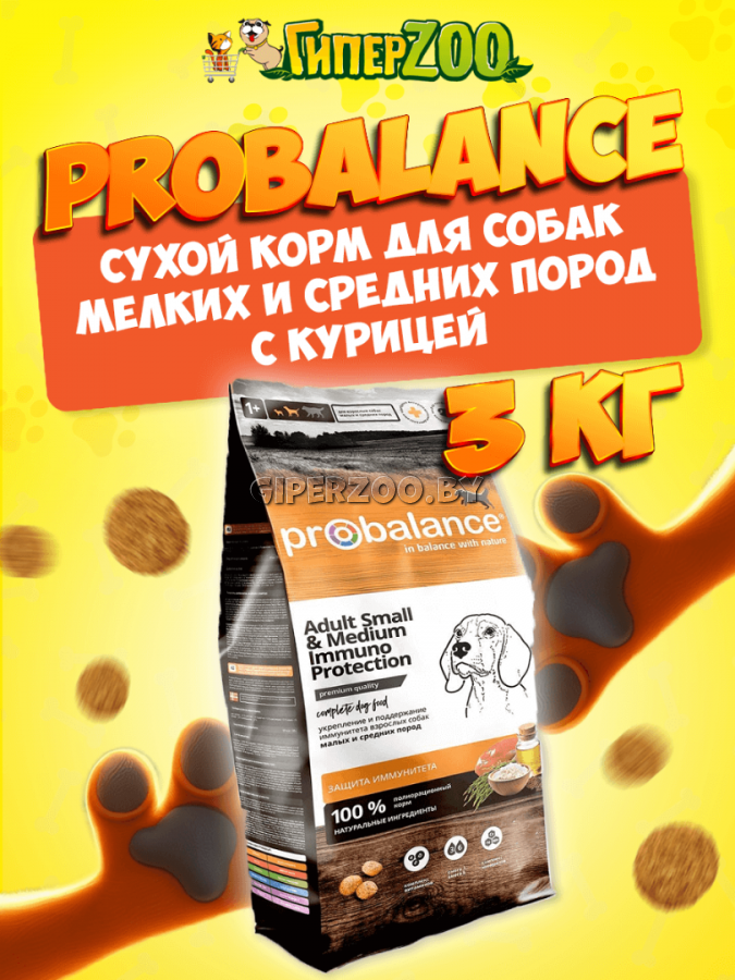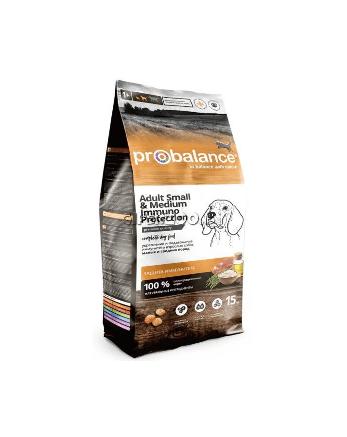 ProBalance Dog Immuno Adult Small&Medium, 3 кг - полнорационный натуральный сухой корм премиум класса с функцией защиты иммунитета и укрепления организма животного. Корм рекомендован для ежедневного кормления взрослых собак малых и средних пород. Рацион разработан практикующими ветеринарами из Дании. В рецептуру входят только натуральные ингредиенты без Е-консервантов и усилителей вкуса.