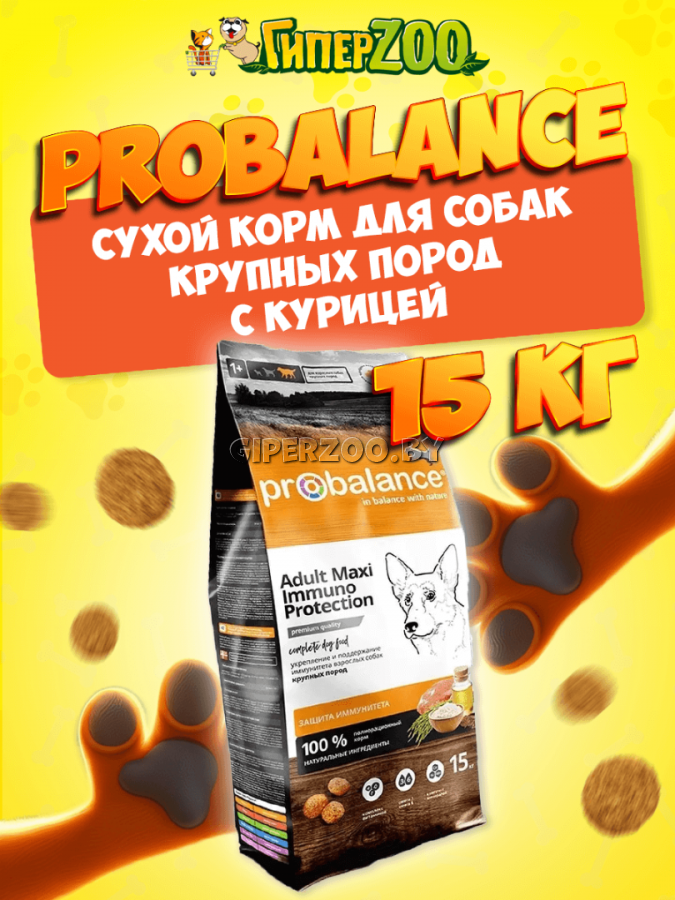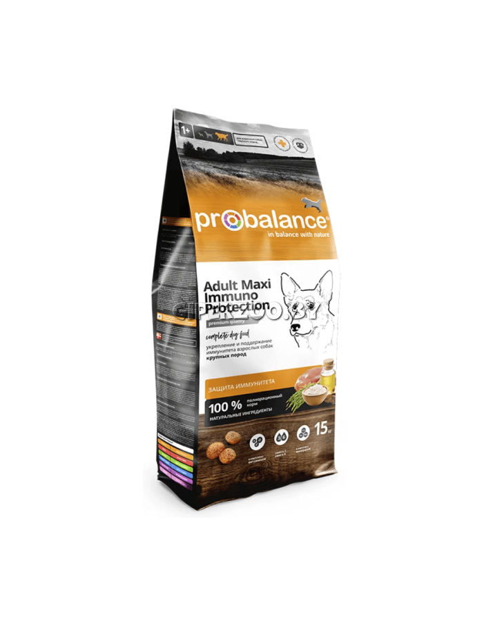 ProBalance Immuno Adult Maxi, 15 кг - полнорационный натуральный сухой корм премиум класса с функцией защиты иммунитета и укрепления организма животного. Корм рекомендован для ежедневного кормления взрослых собак крупных пород. Рецептура корма разработана практикующими датскими ветеринарами. При регулярном кормлении корм способствует укреплению защитных функций организма. В состав корма входят только натуральные ингредиенты без Е-консервантов.