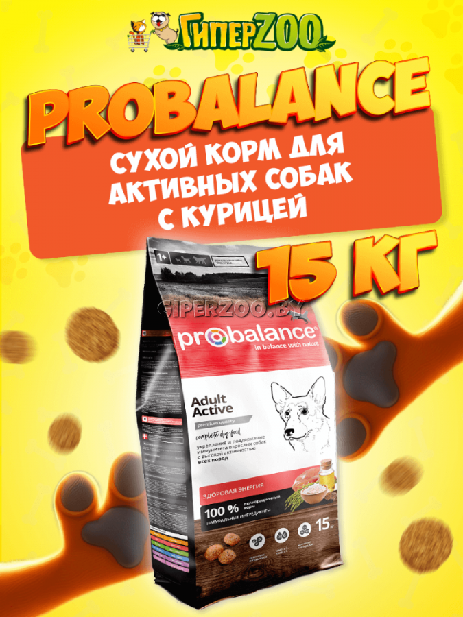 ProBalance Immuno Adult Active, (Курица) 15 кг - полнорационный натуральный сухой корм премиум класса для взрослых собак всех пород с высокой активностью. Рацион подходит для служебных и ездовых собак, а также питомцев, участвующих в соревнованиях. Рацион разработан при участии ветеринаров и кинологов из Дании.