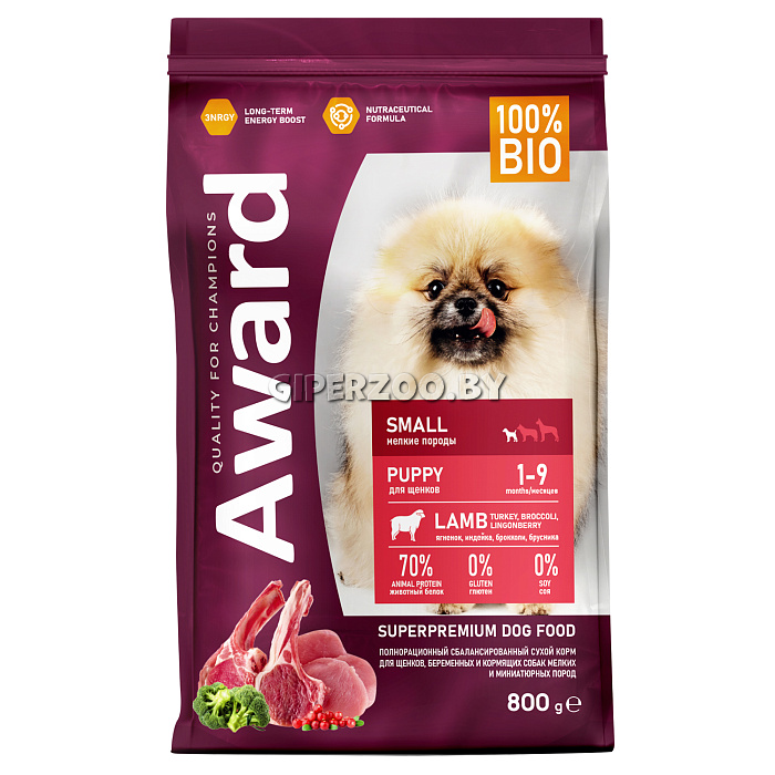 Сухой корм AWARD для щенков от 1 мес, беременных и кормящих сук мелких и мин. пород с ягненком и индейкой с добавлением брокколи и брусники 800 г.