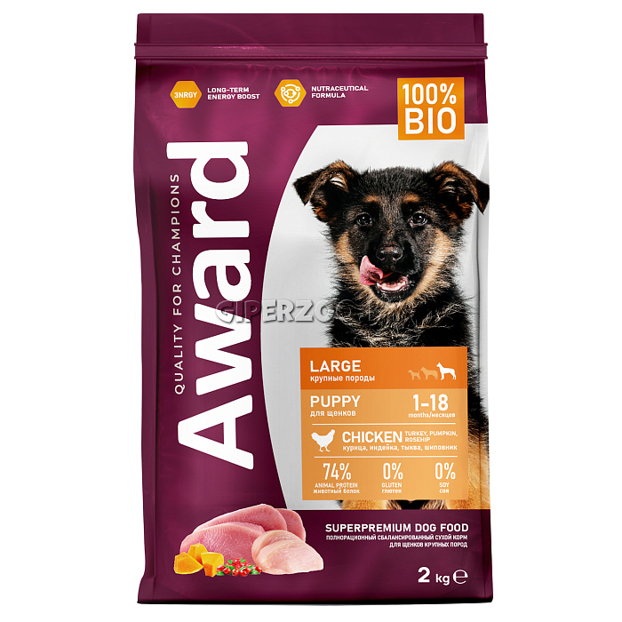 Сухой корм AWARD для щенков от 1 месяца крупных пород с курицей и индейкой с добавлением тыквы и шиповника 2 кг.