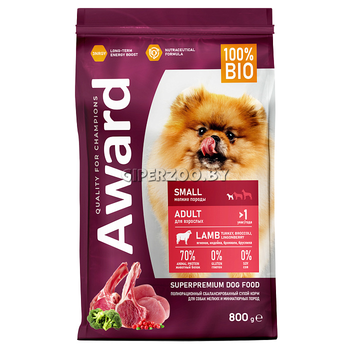 Сухой корм AWARD для взрослых собак мелких и миниатюрных пород с ягненком и индейкой с добавлением брокколи и брусники 800 г.