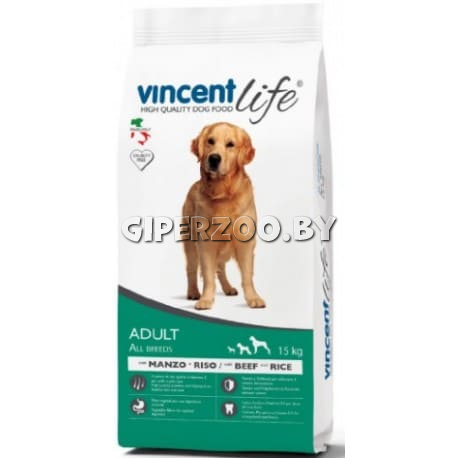 Корм для собак VINCENT VINCENT Life Beef, 15 кг - это полнорационный корм для взрослых собак всех пород с 1 года до 7 лет с говядиной и рисом.
