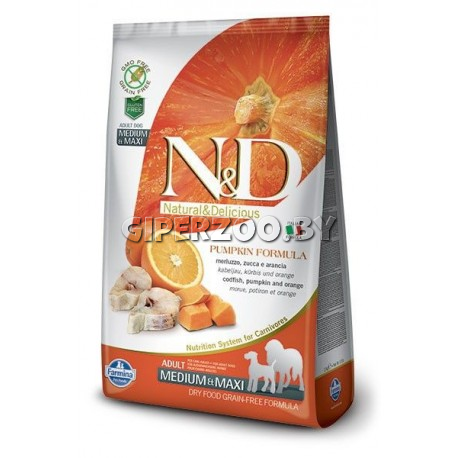 Farmina N&D Dog GF Pumpkin Codfish & Orange Adult Medium & Maxi - полнорационный беззерновой корм для взрослых собак средних и крупных пород. Рыба с апельсином и тыква.