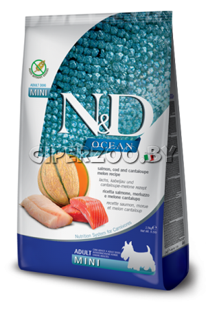 Farmina N&D GF Ocean Dog Salmon, Codfish & Cantaloupe Melon Adult Mini (лосось, треска, дыня), 800 гр - полнорационный корм для взрослых собак мелких пород (лосось, треска, дыня).
