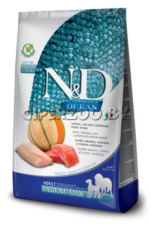 Farmina N&D GF Ocean Dog Salmon, Codfish & Cantaloupe Melon Adult MEDIUM&MAXI (лосось, треска, дыня), 12 кг - полнорационный корм для взрослых собак крупных пород (лосось, треска, дыня).