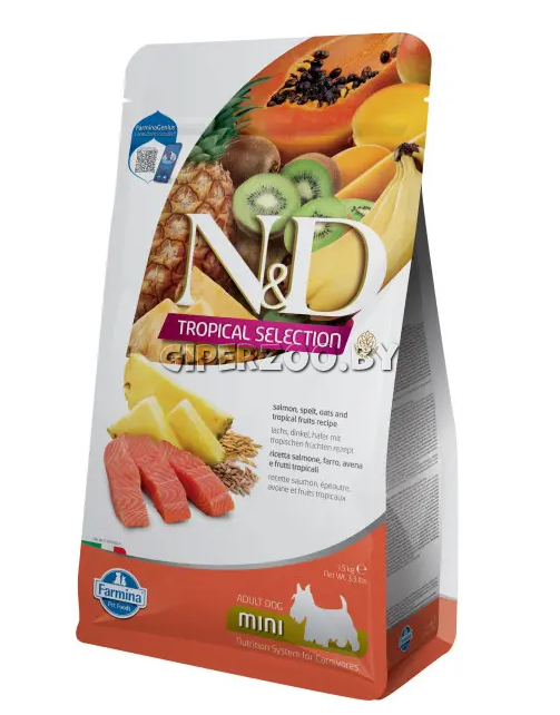 Farmina N&D Tropical selection - это новая линия кормов, разработанная Farmina, изготовленная из зерновых с низким гликемическим индексом (полбой и овсом) и различных тропических фруктов для хорошего самочувствия кошек и собак.