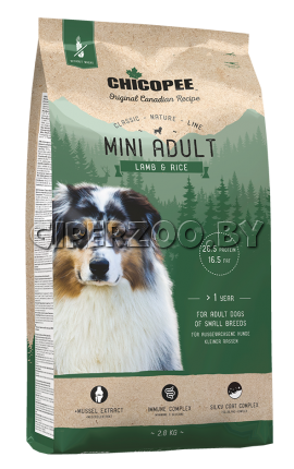 Chicopee CNL Mini Adult Lamb&Rice, сухой корм для мелких пород, 2 кг - это сбалансированный рацион с ягненком и рисом для взрослых собак миниатюрных пород супер-премиум класса.