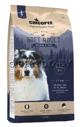 Chicopee CNL Adult Soft Salmon & Rice, корм для собак, 15 кг - это полувлажный корм для взрослых собак всех пород с лососем и рисом, супер-премиум класса.