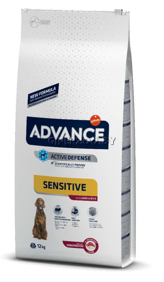 Advance Adult Sensitive (Ягненок с рисом), 12 кг ‒ это полноценный и сбалансированный сухой корм, специально разработанный для собак средних и крупных пород с чувствительным желудком.