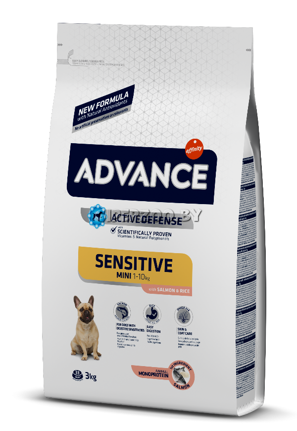 Формула корма с одним белком, состоящая из лосося как единственного источника животного белка вместе с рисом, делает Advance Sensitive Mini легко усваиваемым продуктом, идеально подходящим для собак с чувствительным желудком.