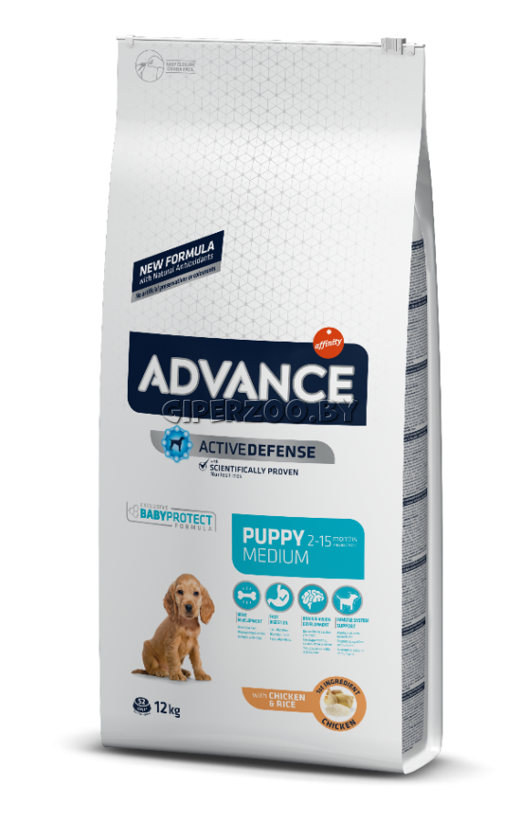Advance Dog Puppy Protect Medium - это высококачественный сбалансированный полнорационный корм для щенков (в возрасте от 2-12 месяцев) средних пород (вес взрослых животных от 10 до 30 кг), а также для беременных и кормящих собак.