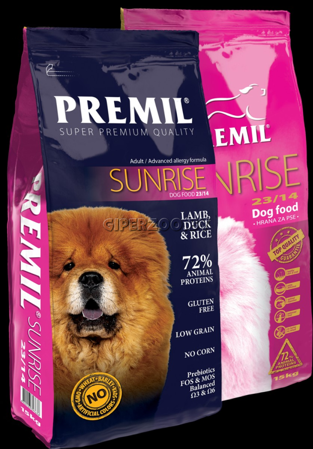 Premil SuperPremium Sunrise (Премил СуперПремиум Санрайз) для усиления иммунитета собак, беременных собак, для взрослых чувствительных собак, склонных к аллергиям с тунцом, яненком и рисом обезвоженное мясо ягненка и тунца 27%, рис 27%, овес, растительные масла холодного отжима, куриный жир, рыбий жир, льняное семя 4%, свекловичная стружка, картофель, гидролизованная печень, пивные дрожжи, сушеные яблоки, инулин (экстракт цикории), MOC (дрожжевой экстракт) и лецитин.