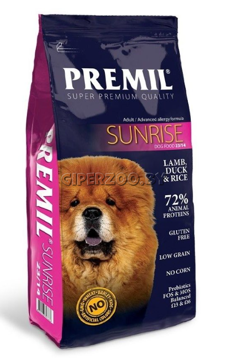 Premil SuperPremium Sunrise (Премил СуперПремиум Санрайз) для усиления иммунитета собак, беременных собак, для взрослых чувствительных собак, склонных к аллергиям с тунцом, яненком и рисом