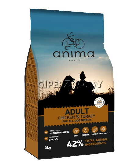 Рецепт Anima Chicken & Turkey — это сбалансированный корм премиум-класса, предназначенный для взрослых собак всех пород. Этот рецепт, содержащий 42% ингредиентов животного происхождения, предлагает высококачественный гидролизованный белок курицы и индейки для оптимального белка и вкуса.