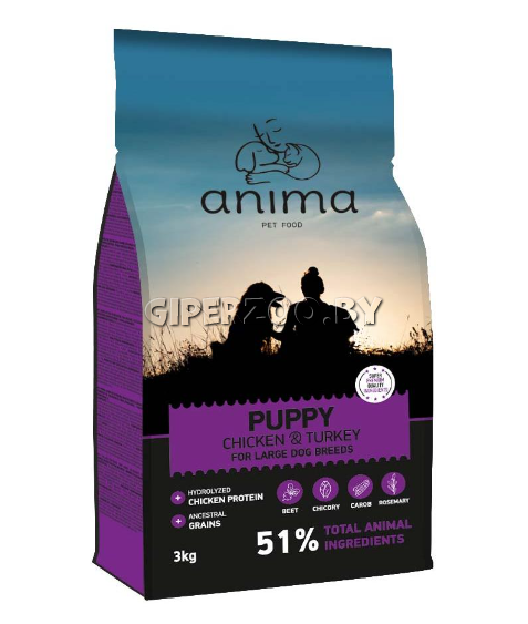 Anima Puppy Large breed (Курица, индейка) – это высококачественное и питательное блюдо, созданное для поддержки здорового роста и развития молодых собак крупных пород. В состав рецепта входят 51% общего количества ингредиентов животного происхождения, высококачественный гидролизованный белок курицы и индейки, обеспечивающий незаменимые аминокислоты для сильных мышц и развития тканей.