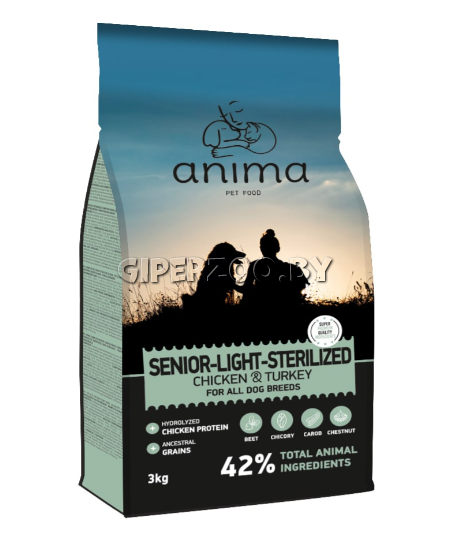 Корм сухой супер-премиум "ANIMA" для пожилых собак, страдающих ожирением/стерилизованных, курица, индейка, рис, 3 кг Anima Senior, Light, Sterilized – рецепт с курицей и индейкой — это тщательно разработанный корм для пожилых, полных или стерилизованных собак всех пород.