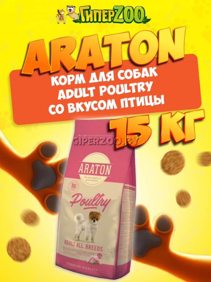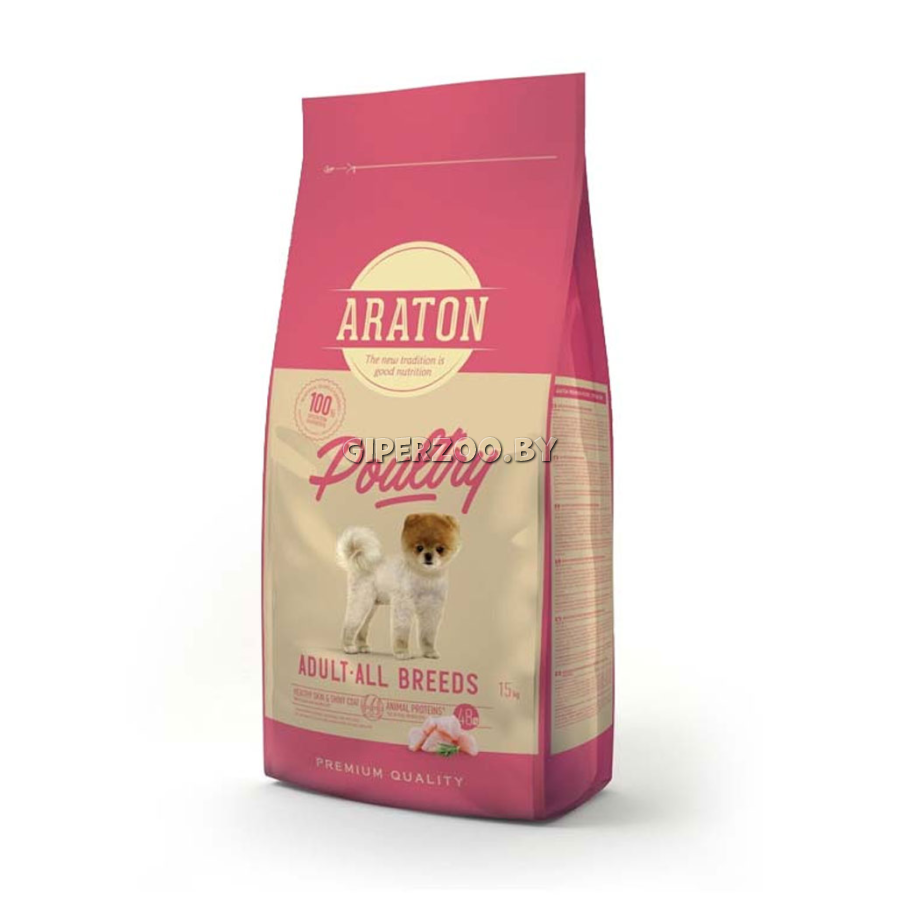Сухой корм для собак Araton Adult Poultry (Аратон Эдалт Полтри), птица, 15 кг - полнорационный сухой корм с мясом домашней птицы для взрослых собак всех пород.Большое количество белков : 48% белков животного происхождения из всего количества белков. Обеспечивает легкое пищеварение и поддерживает необходимое количество энергии. Кукуруза: отличный источник углеводов, не вызывающий аллергических