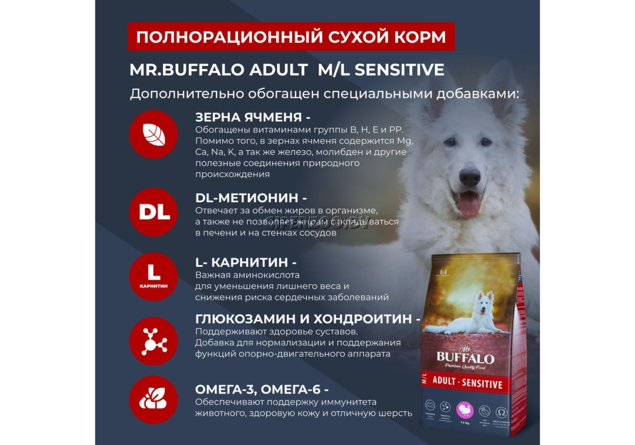 Mr.Buffalo ADULT M/L SENSITIVE для собак средних и крупных пород (индейка), 14 кг - формула рациона с индейкой богата высококачественным белком и способствует поддержанию оптимального пищеварения, которое позволяет вашему питомцу эффективно усваивать питательные вещества.
