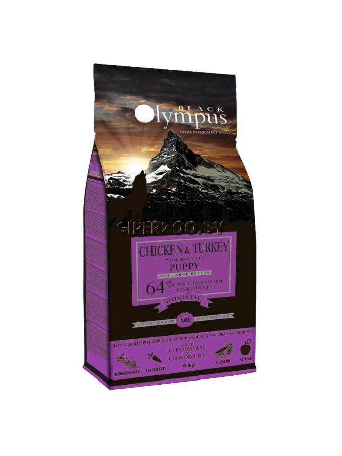 Black Olympus Puppy Large Breeds Chicken & Turkey — низкозерновой корм класса холистик с курицей, индейкой и бурым рисом для щенков крупных пород. Корм изготовлен из высококачественных ингредиентов, которые обеспечивают растущий организм собаки оптимальным количеством белков, жиров, клетчатки, витаминов и минералов. Полнорационное и сбалансированное питание поддерживает уязвимую иммунную систему и чувствительное пищеварение, благотворно влияет на состояние кожи и шерсти, способствует укреплению зубов, костей, иммунной системы и организма в целом. Состав: Мясо птицы 50% (дегидратированная курица и индейка 35%, гидролизованная свежая курица 15%), бурый рис, тапиока, свиной жир (8%), куриный жир (6%), пульпа свеклы, порошок рожкового дерева, F.O.S. (фруктоолигосахариды), дегидратированное яблоко, дегидратированная морковь, пивные дрожжи, экстракт розмарина, глюкозамин (0,057%), хондроитинсульфат (0,04%)
