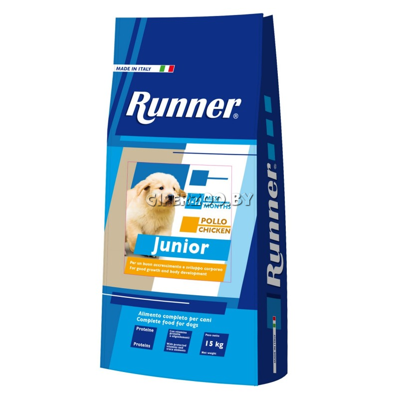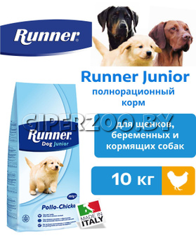 Runner Junior для щенков всех пород, 10 кг — полнорационный корм для растущих собак, щенков от рождения до взрослой жизни. Для беременных и кормящих сук.