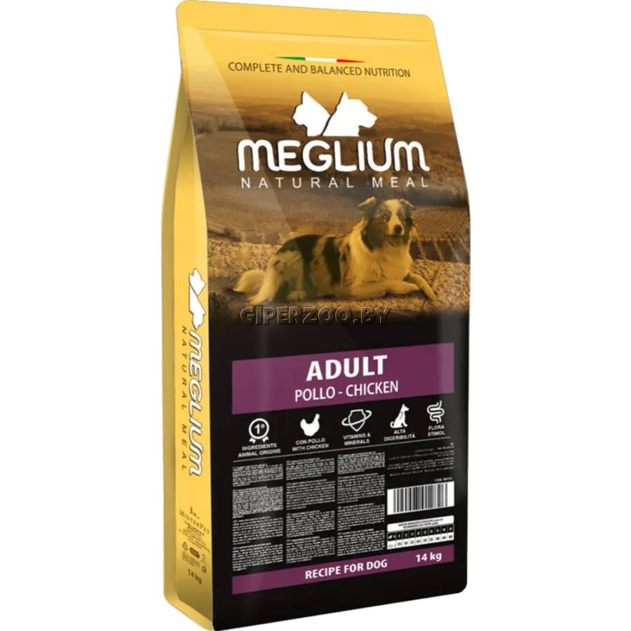 MEGLIUM Adult Chicken для собак(курица), 14 кг – полнорационный корм со вкусом курицы, приготовленный из высококачественного мяса, богатого белками. Со сбалансированным соотношением белков и жиров, свекольной мякоти как превосходного источника клетчатки, витаминов и минералов, что делает Meglium Adult Chicken кормом, отвечающим всем потребностям в питании взрослой собаки.