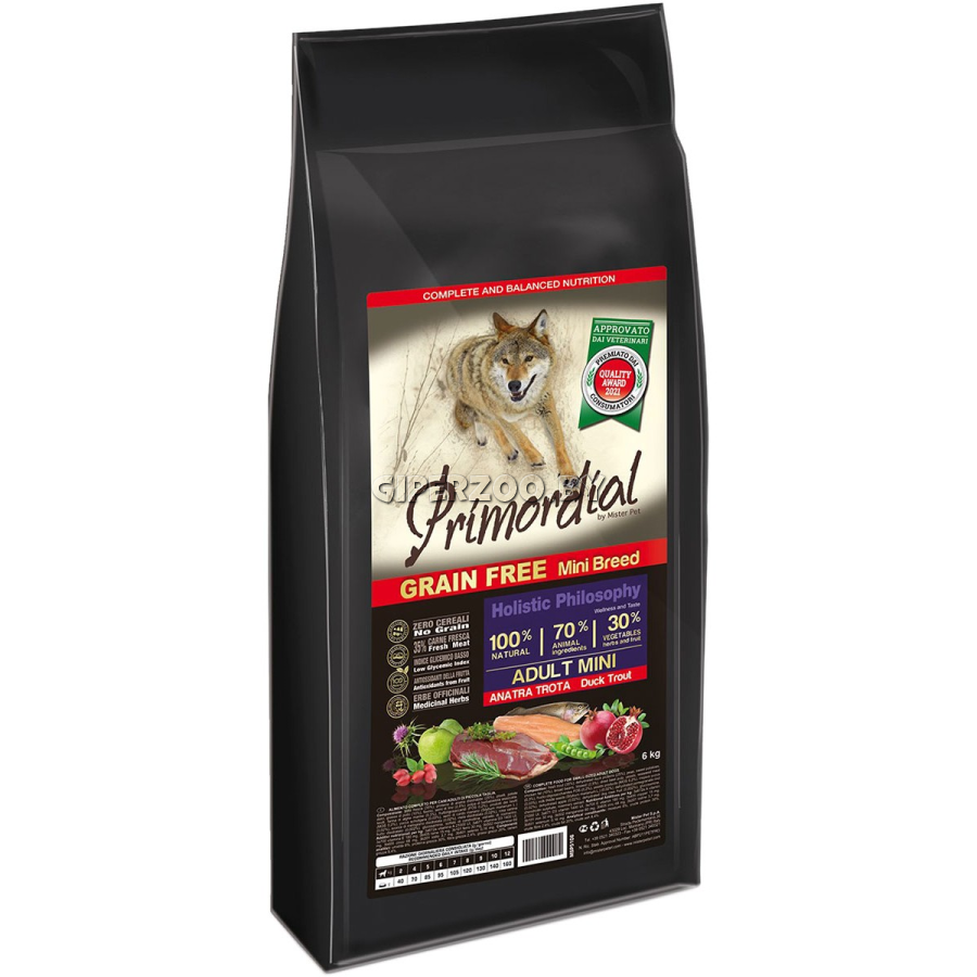 Primordial Adult Mini Trout and Duck для собак(форель, утка), 6 кг - это не только Мясо, это также 30% растительных продуктов, содержащих множество активных веществ и эфирных масел, это холистический корм, идеально подходящий для сбалансированного питания собак.