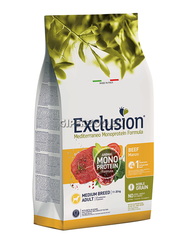 EXCLUSION Monoprotein Medium Beef Noble Grain (говядина), 12 кг - полнорационный сбалансированный корм на основе высококачественного зерна и дегидрированного монопротеина животного происхождения.