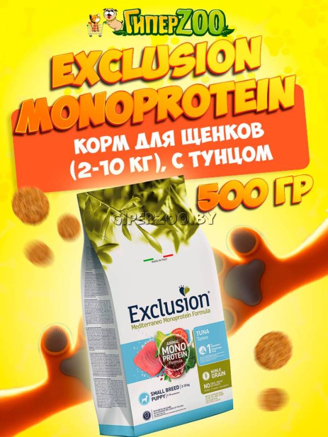 EXCLUSION Monoprotein Tuna Noble Grain для щенков мелких пород (тунец), 500 г – полнорационный сбалансированный корм на основе высококачественного зерна и дегидрированного монопротеина животного происхождения. Сохранен природными антиоксидантами и интегрирован с бета-глюканами. Он обогащен инновационным рецептом суперпродуктов средиземноморской традиции: конопли, оливкового масла, помидоров, граната, брокколи и цикория.