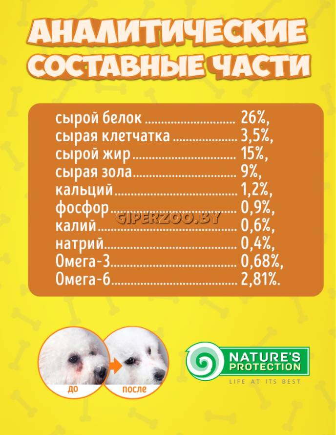 Аналитический состав: сырой белок – 26%, сырая клетчатка – 3,5%, сырой жир – 15%, сырая зола – 9%, кальций – 1,2%, фосфор – 0,9%, калий – 0,6%, натрий – 0,4%, Омега-3 жирные кислоты – 0,68%, Омега-6 жирные кислоты – 2,81%.