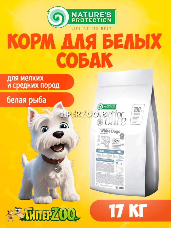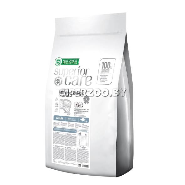 Сухой беззерновой корм Nature's Protection Superior Care с белой рыбой для взрослых собак малых и миниатюрных пород – это полноценный и сбалансированный корм Супер Премиум сегмента с источником белка и сырья высочайшего качества, который помогает бороться с коричневыми пятнами от слез и поддерживать кожу и шерсть здоровыми. Корм содержит формулу Tear Stains off – тщательно подобранный комплекс аминокислот и хорошо сбалансированных ингредиентов в составе. Обогащен компонентами, обеспечивающими отличную производительность для хорошего самочувствия питомца.содержит антарктический криль-источник Омега-3 и холина. Aнaлитический состав / 1кг: сырой белок - 24%, необработанные масла и жиры - 13%, сырая зола - 9,5%, сырая клетчатка - 4%, кальций - 1,2%, фосфор - 0,9%, калий - 0 , 6%, натрий - 0,4%, Омега-3 жирные кислоты - 0,64%, Омега-6 жирные кислоты - 2,78%.