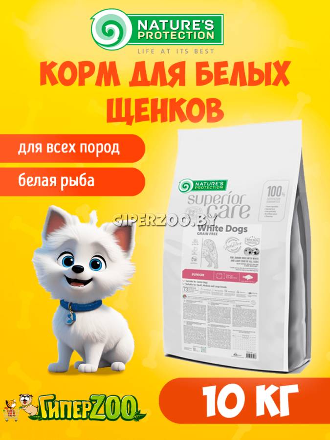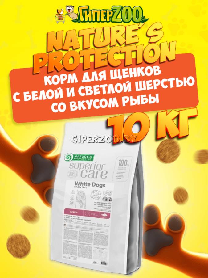 Nature's Protection Superior Care White Dog Junior- сухой беззерновой корм с Белой рыбой для щенков всех размеров с белой и светлой шерстью - это полноценный и сбалансированный корм. Размер гранул этого корма очень универсален - 13-15 мм, что делает его подходящим для собак всех размеров и возрастов. Преимущества: - Один корм для собак всех размеров и стадий жизни; - Гипоаллергенный; - Удаляет слезные пятна; - Хорошо усваиваемый; - Ингредиенты высочайшего качества; - Натуральные антиоксиданты; - Сбалансированное питание; - Без зерна.