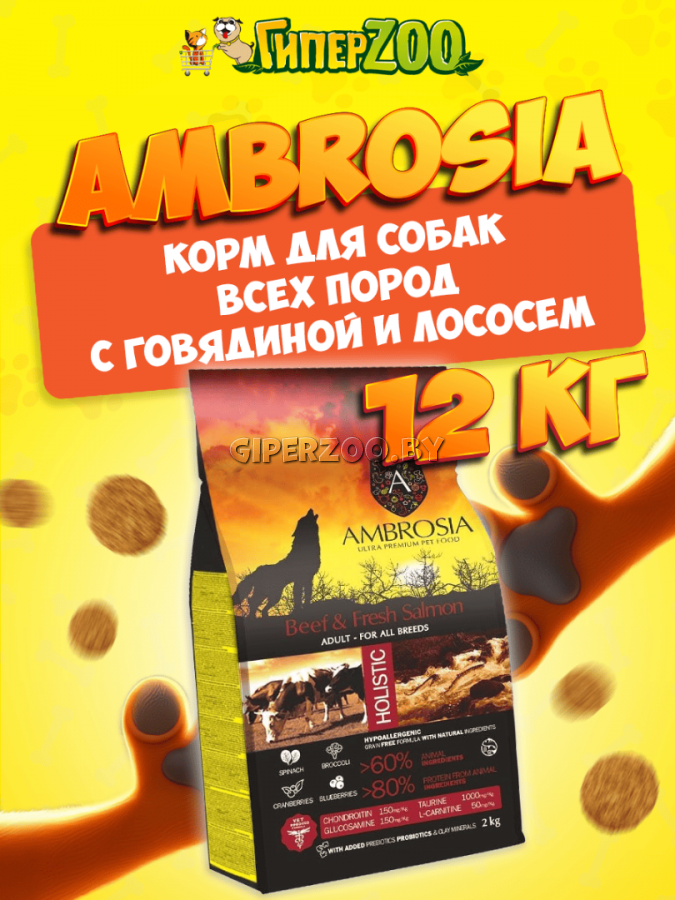 Ambrosia Adult All Breeds (Говядина, лосось), 12 кг - это превосходный беззерновой корм, предлагающий оптимальное питание для собак всех пород.