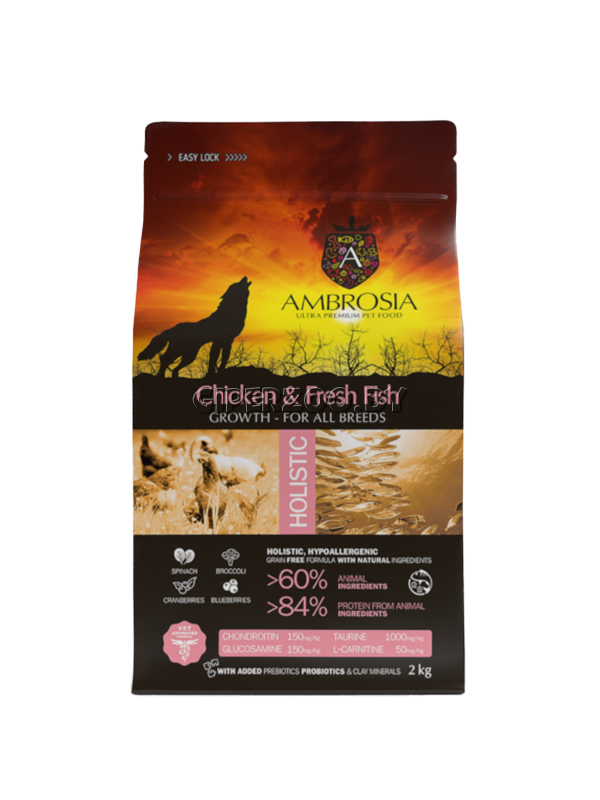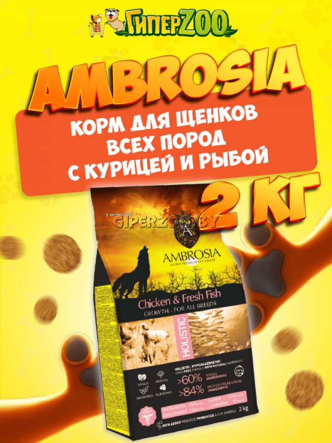 Ambrosia Puppy All Breeds (Курица, рыба), 2 кг - сухой корм сочетает в себе легко усваиваемый белок из тщательно отобранной свежей рыбы с высокой питательной ценностью, куриный белок, а также добавки брокколи, шпината, клюквы и черники. Также включает пребиотики и пробиотики для улучшения системы пищеварения и иммунитета. Также соответствующее количество кальция для правильного роста скелета.